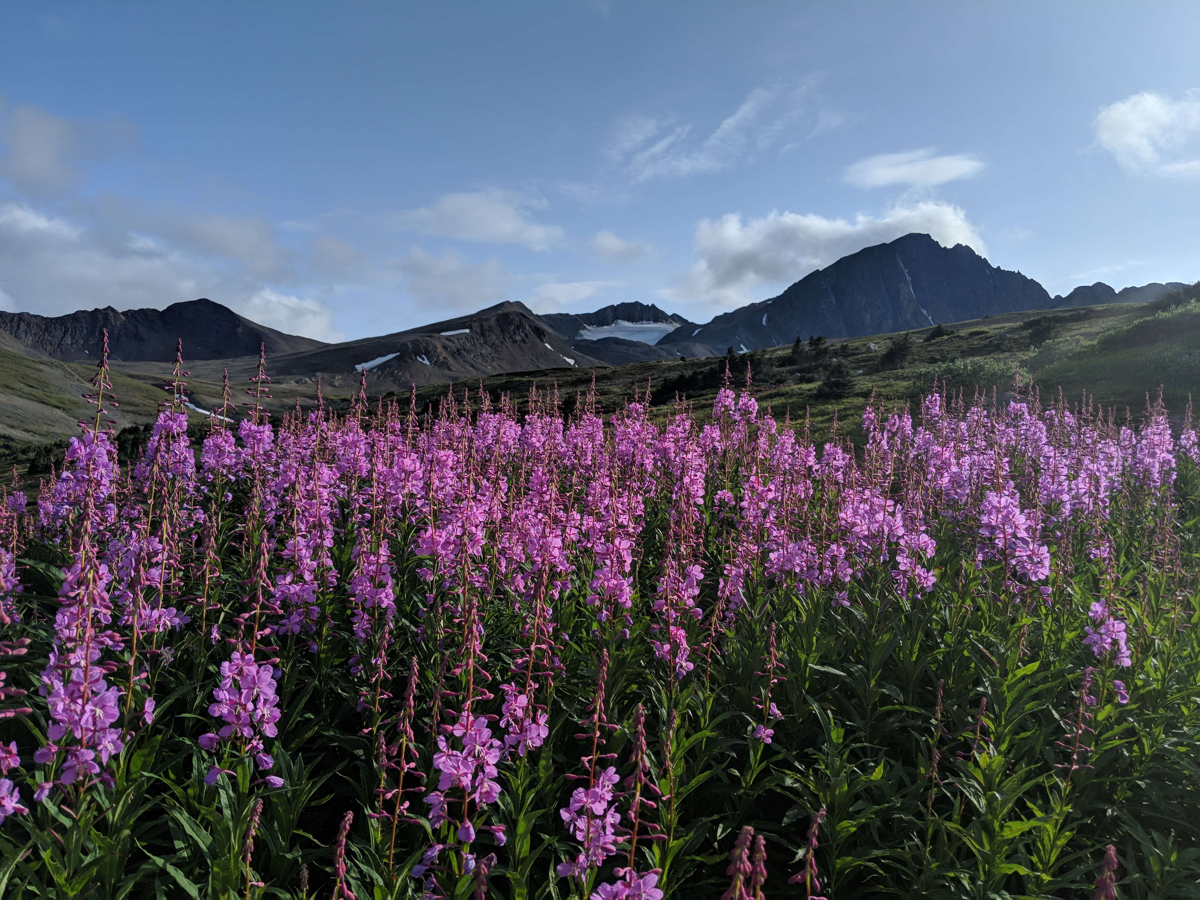 We hiked up in the beautiful evening. It was 7pm and the sun was out with a light breeze. The fireweed was in patches all across the mountains. Paddy Peak was clear and as we hiked higher and higher the views became more breathtaking.