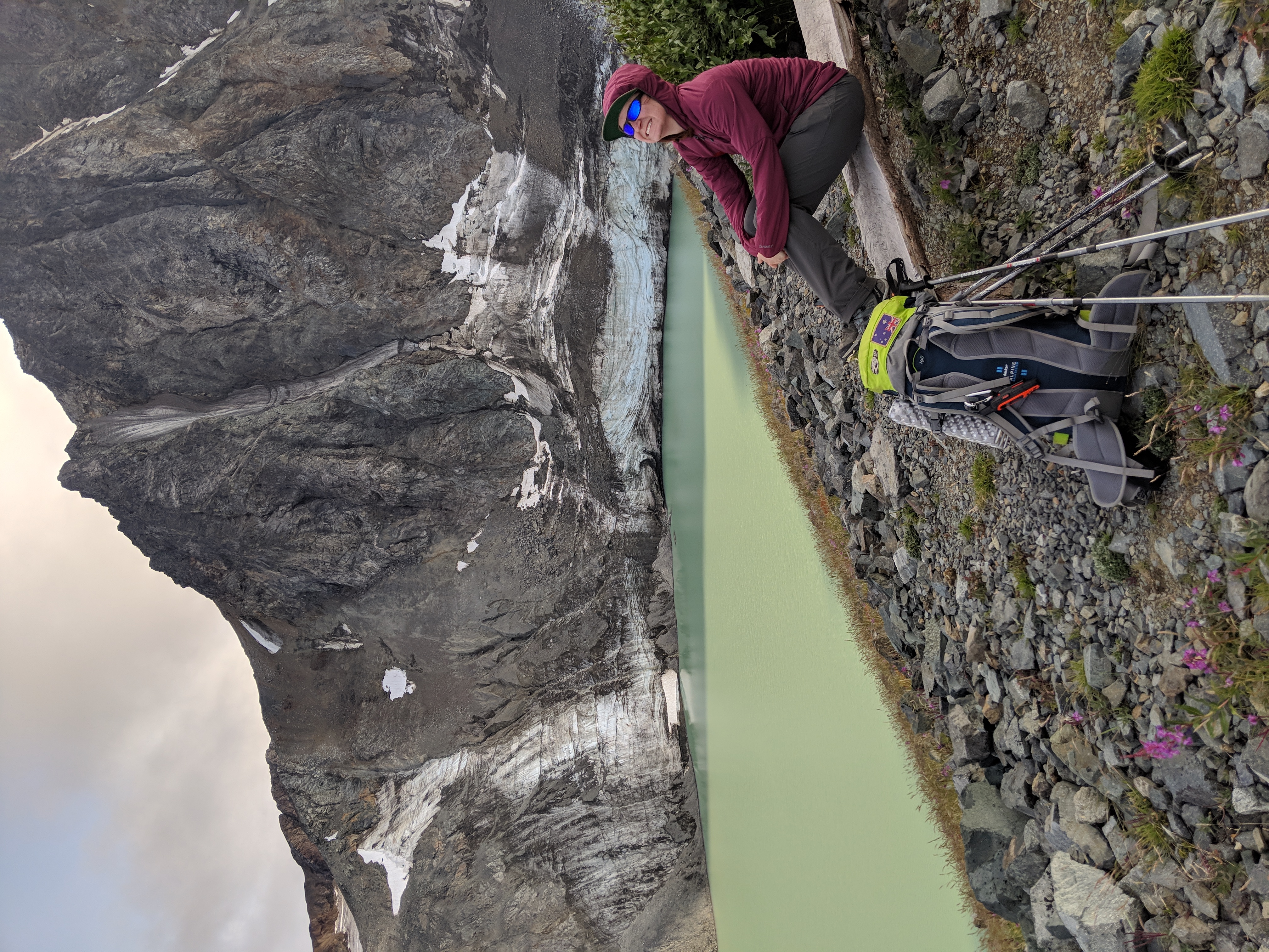 We arrived up above the lake and it was beautiful. I had never seen Paddy Peak in the summer and it was truly incredible. We took too many photos but the cold air off the glacier caused some chilly digits. We hiked a bit further down and decided to find a camping spot.